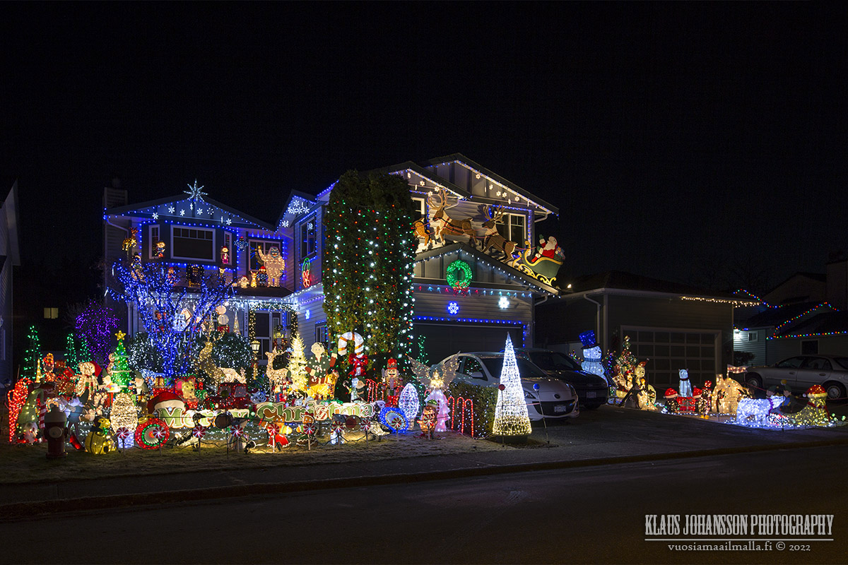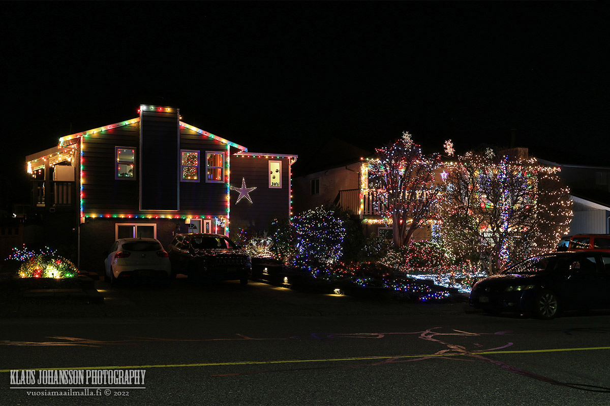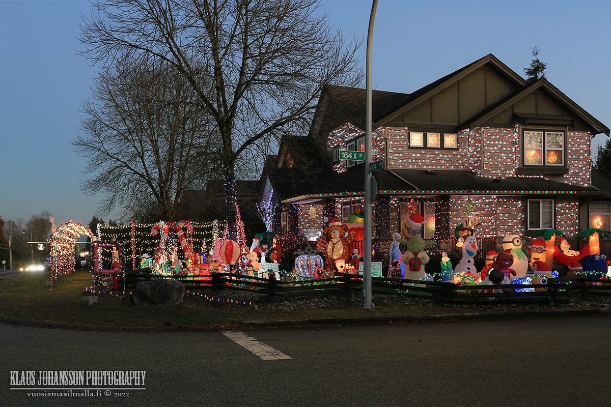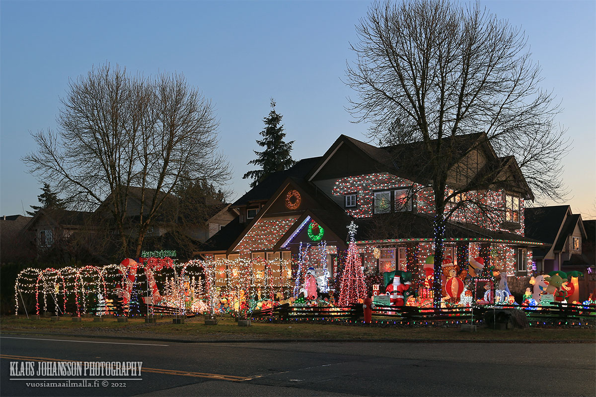 Tämän kertainen jouluvalokierros jakautui kahteen osaan, kun pari viikkoa sitten minä kävin ensimmäisellä valokuvauskierroksella työpäiväni jälkeen. Koska toimistomme sijaitsee Vancouverin esikaupungissa, oli sieltä hyvä jatkaa syvemmälle kauempiin esikaupunkeihin katsomaan paikallisten värikkäitä rakennelmia.
