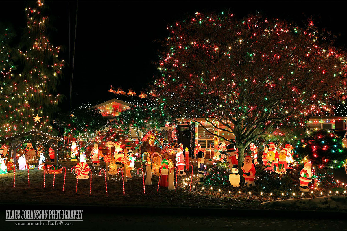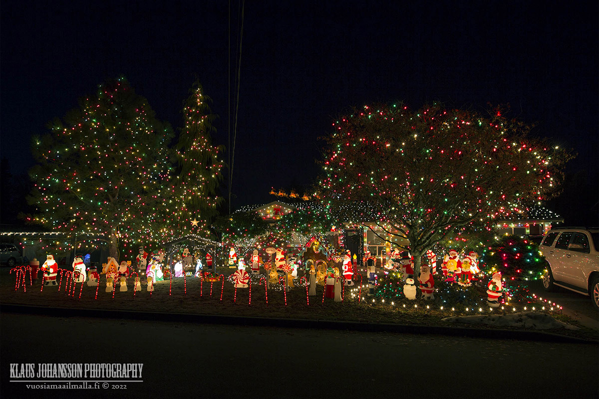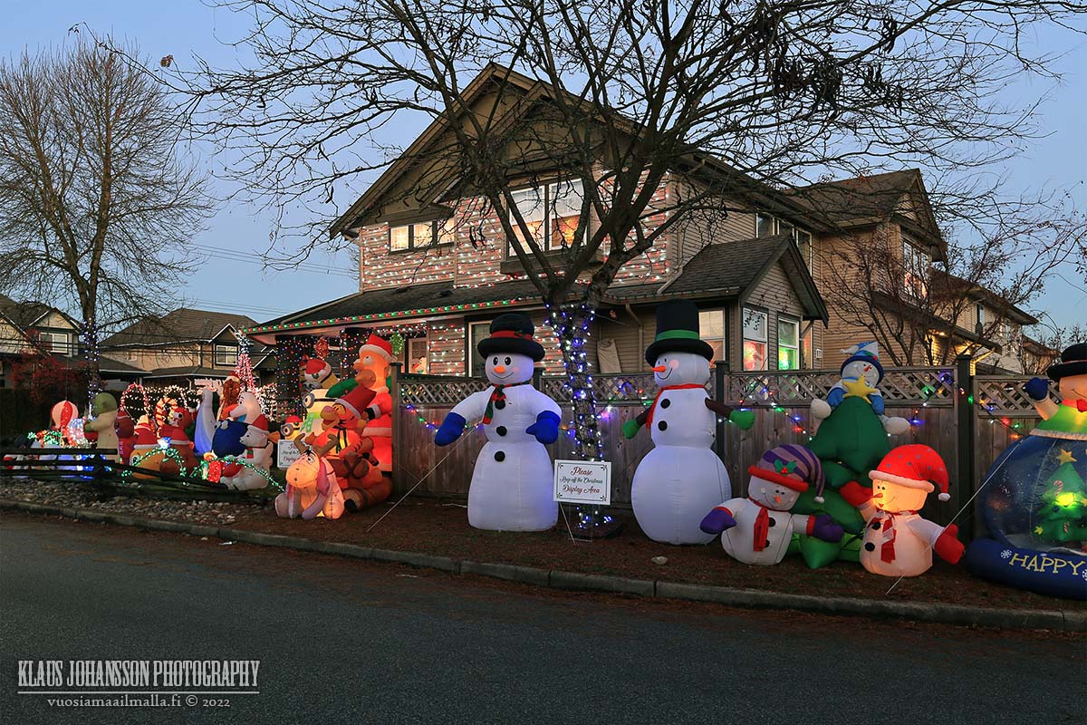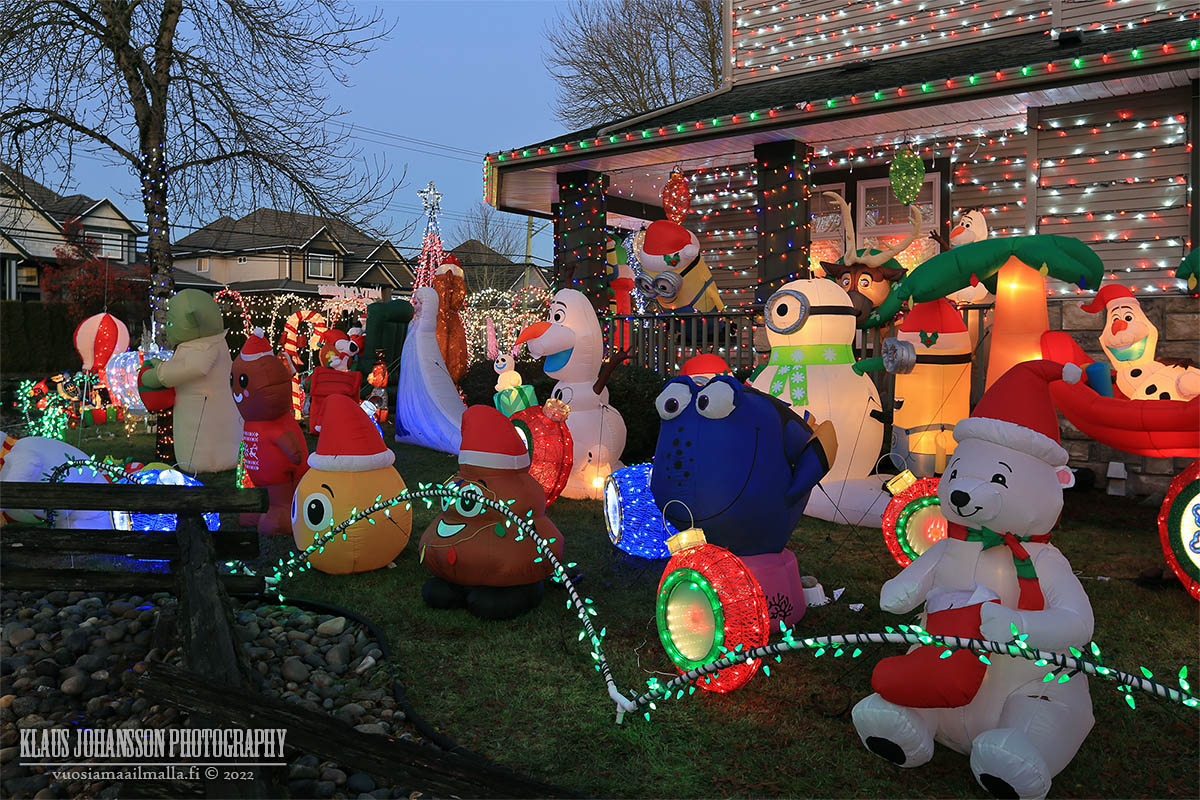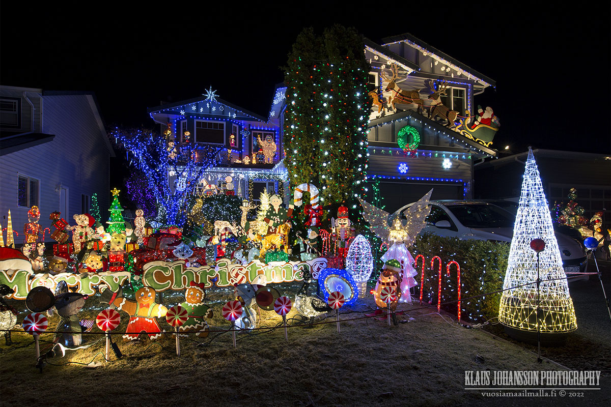 Tämän kertainen jouluvalokierros jakautui kahteen osaan, kun pari viikkoa sitten minä kävin ensimmäisellä valokuvauskierroksella työpäiväni jälkeen. Koska toimistomme sijaitsee Vancouverin esikaupungissa, oli sieltä hyvä jatkaa syvemmälle kauempiin esikaupunkeihin katsomaan paikallisten värikkäitä rakennelmia.